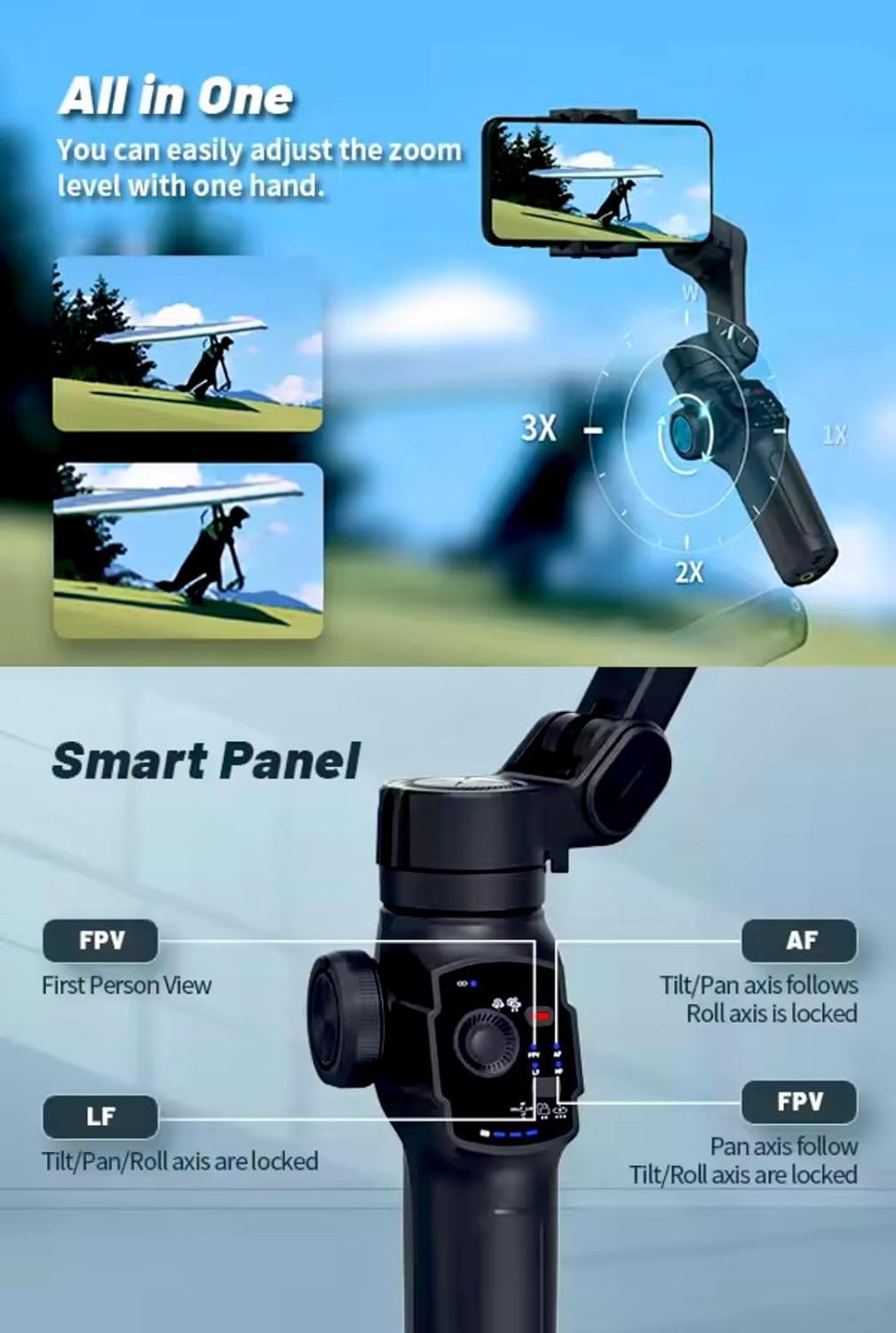 MULTIPLE MODES: Four distinct working modes with clear gimbal status display for easy operation and monitoring.